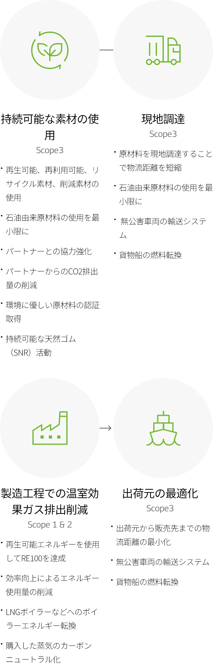 原材料調達、輸送、製造、物流といったバリューチェーン全体にわたるGHG削減活動を通じて、カーボンニュートラルを目指します。