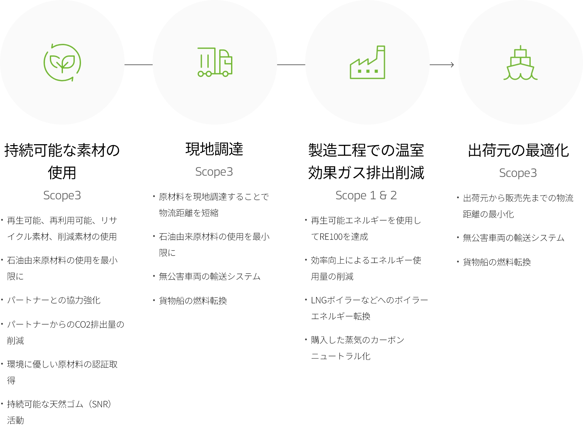 当社は、具体的なカーボン削減計画を策定し、4つの主要な取り組みを柱として段階的に着実に実行していきます。それは、低炭素経営システムの構築、プロセスにおけるエネルギー使用効率の改善、再生可能エネルギーの利用拡大、再生可能エネルギーを活用した革新的な削減技術の導入です。短期的には、タイヤ製造プロセス全体におけるエネルギー使用を最小化し、長期的なエネルギー転換に向けた基盤を築くために継続的な見直しを行いながら、環境に優しい代替エネルギーを模索していきます。私たちは、2050年のバリューチェーンにふさわしいカーボンニュートラル・ロードマップを策定し、それぞれの領域に特化した詳細な実行戦略の開発・実施を進めていきます。