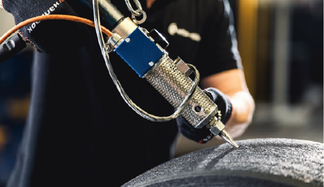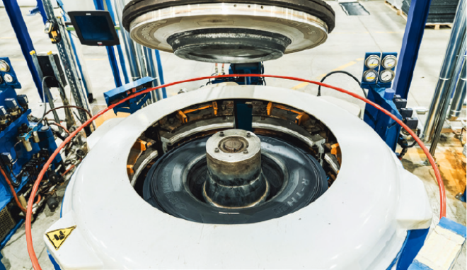 The curing press creates the new tread and sidewall and the finish on the Alphatread tyre is „as new“. This is the identical process used for Hankook premium tyres.